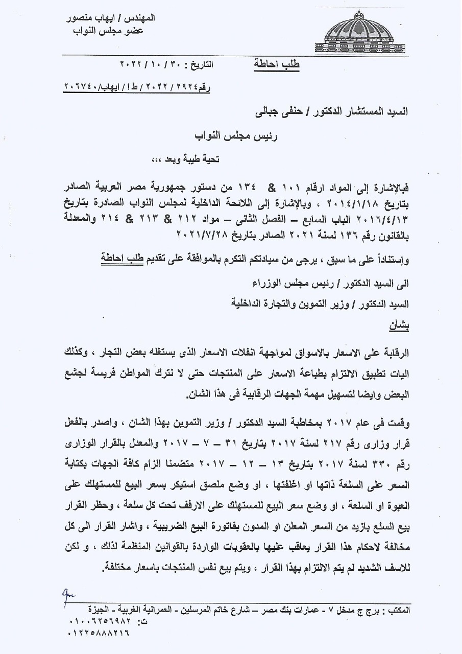 تقدم المهندس أيهاب منصور، رئيس الهيئة البرلمانية للحزب المصري الديمقراطي الاجتماعي بطلب إحاطة موجه لرئيس مجلس الوزراء ، ووزير التموين والتجارة الداخلية بشأن الرقابة على الاسعار بالاسواق لمواجهة انفلات الأسعار الذى يستغله بعض التجار ، وكذلك آليات تطبيق الالتزام بطباعة الأسعار على المنتجات حتى لا نترك المواطن فريسة لجشع البعض و لتسهيل مهمة الجهات الرقابية فى هذا الشان.