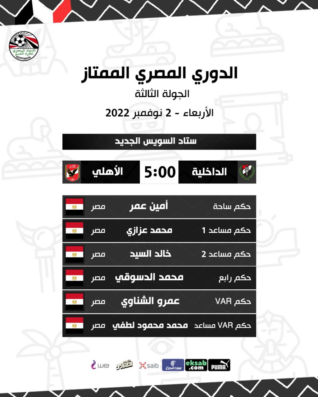 حكام مباراة الأهلي والداخلية، أمين عمر حكم ساحة، محمد عزازي حكم مساعد1، خالد السيد مساعد2، محمد الدسوقي حكم رابع، عمرو الشناوي حكم "VAR"، محمد محمود لطفي حكم مساعد "VAR".