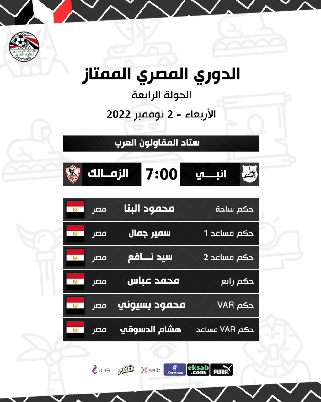 حكام مباراة الزمالك و إنبي، محمود البنا حكم ساحة، سمير جمال حكم مساعد1، سيد نافع حكم مساعد2، محمد عباس حكم رابع، محمود بسيوني حكم "VAR"، هشام الدسوقي حكم مساعد "VAR".