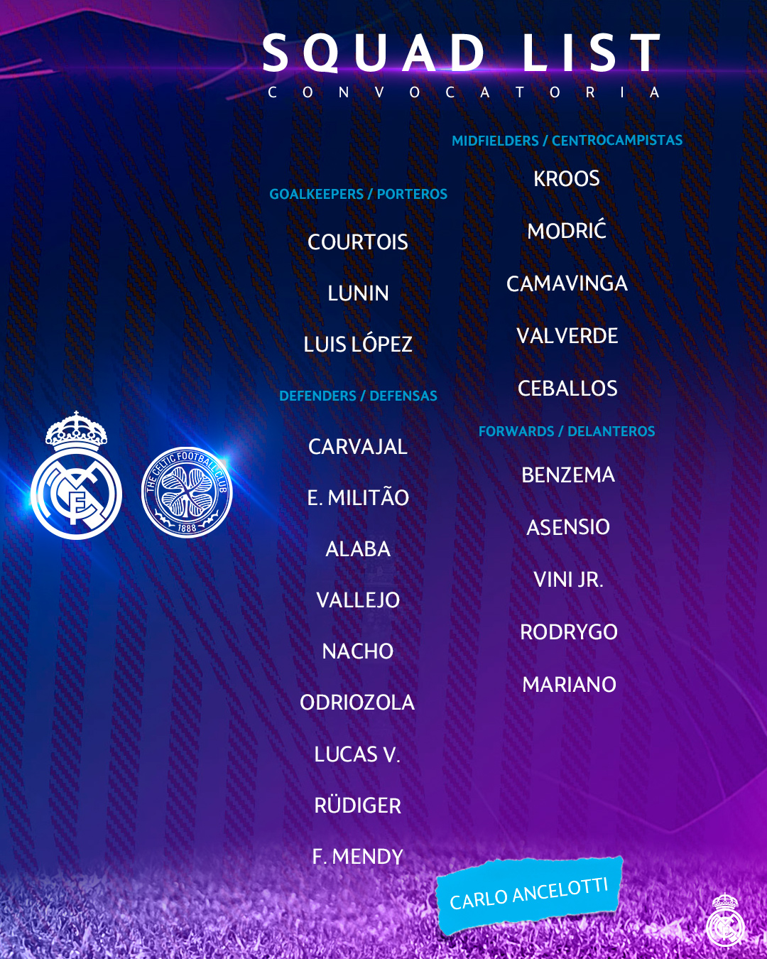 أعلن كارلوس أنشيلوتي، المدير الفني لريال مدريد، عن قائمة الفريق لمواجهة سيلتك، غداً الأربعاء، في ختام دور المجموعات بدوري أبطال أوروبا.
