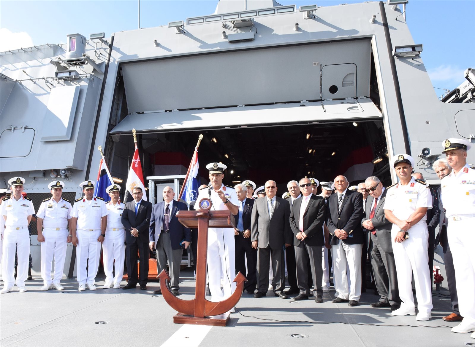 وألقى الفريق أشرف عطوة قائد القوات البحرية كلمة نقل خلالها تحيات الرئيس عبدالفتاح السيـسى رئيس الجمهورية القائد الأعلى للقوات المسلحة ، والفريق أول محمد زكى القائد العام للقوات المسلحة وزير الدفاع والإنتاج الحربى لطاقم الفرقاطة على الجهد المبذول أثناء فترة الإعداد ، حيث تم إعداد وتأهيل الأطقم التخصصية والفنية العاملة على الوحدة الجديدة فى توقيت قياسى وفقاً لبرنامج متزامن تم تنفيذه على مرحلتين بمصر وألمانيا .