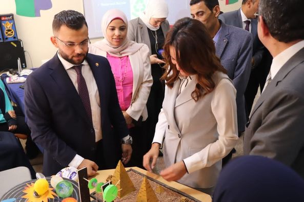 حيث استمعت إلى عرض الطلاب عن مشروعاتهم لإعادة استخدام النفايات في صنع حاويات للقمامة بالمدرسة، كما استمعت إلى عرض من طلاب المرحلة الإعدادية عن تغير المناخ.