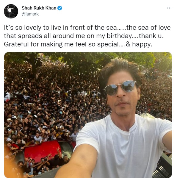 عبر شاروخان عن سعادته البالغة بحب الجمهور له، ونشر صورة له من شرفة منزله مع جمهوره أثناء وقوفهم أسفل منزله للاحتفال بعيد ميلاده عبر حسابه على موقع التدوينات القصيرة "تويتر".