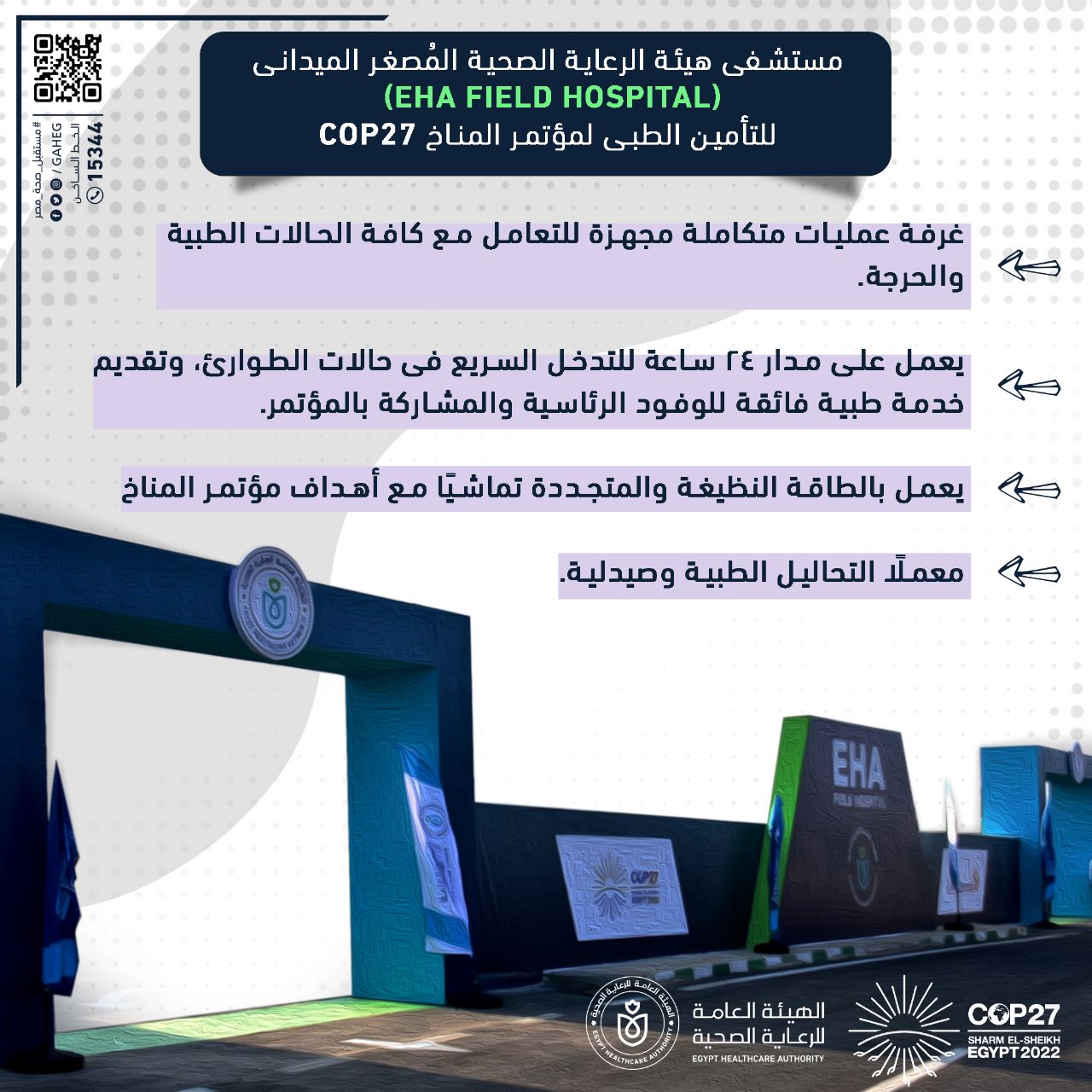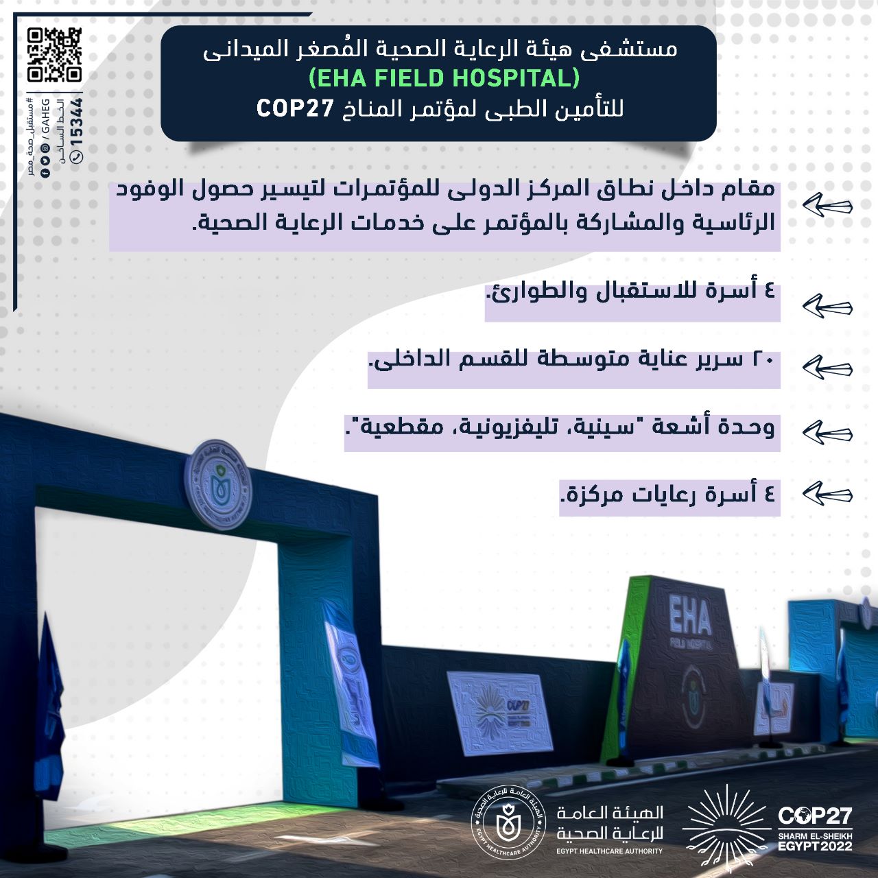 أعلنت الهيئة العامة للرعاية الصحية، برئاسة الدكتور أحمد السبكي، رئيس مجلس إدارة الهيئة، مساعد وزير الصحة والسكان، المشرف العام على مشروع التأمين الصحي الشامل، استعدادات مستشفى هيئة الرعاية الصحية المُصغر الميداني (EHA FIELD HOSPITAL) للتأمين الطبي لمؤتمر المناخ <<COP27>> ..