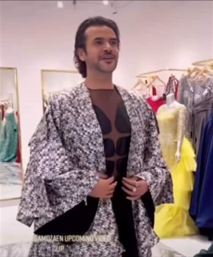 وظهر سامو زين داخل اتيليه فساتين وارتدى ملابس تشبه الفستان النسائي من خلال توب شفاف باللون الأسود وعليه كردجيان باللونين الأبيض في الأسود مع بنطلون من الجلد الأسود.