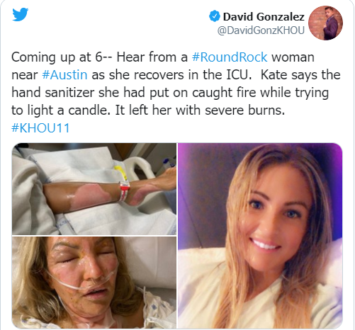 ويُذكر أن الخبراء قد حذروا من أن معقمات الأيدي، التي يحتوي الكثير منها على الكحول، ويمكن أن تكون قابلة للاشتعال، وعادة ما تحتوي الزجاجات على تحذير بإبقاء المنتج بعيداً عن اللهب، أو النار.