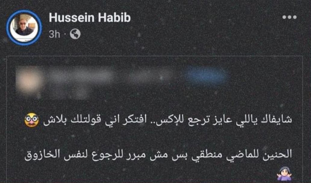ونشر حسين حبيب فيديو من الكاتبة آية شعيب تقول خلاله :"شايفاك ياللي عايز ترجع للإكس..أفتكر إني قولتلك بلاش، الحنين للماضي منطقي بس مش مبرر للرجوع لنفس الأزمة".