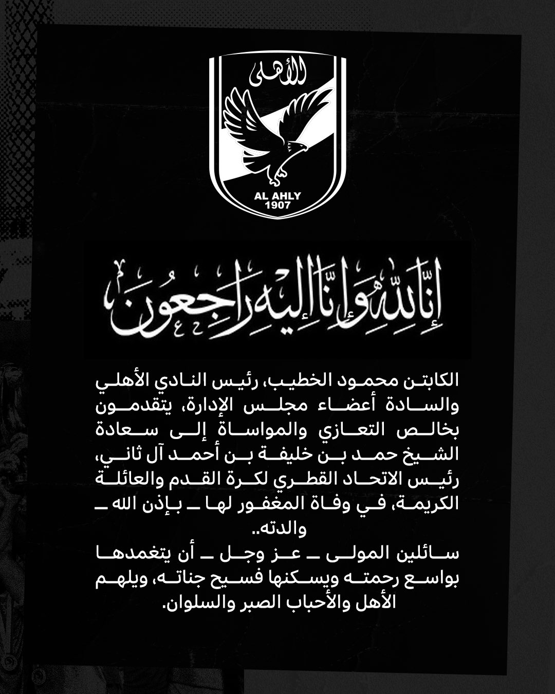 نعى مجلس إدارة النادي الأهلي، برئاسة محمود الخطيب وفاة والدة الشيخ حمد بن خليفة بن أحمد آل ثاني رئيس الاتحاد القطري لكرة القدم، وذلك عبر صفحته الرسمية بموقع "فيس بوك".