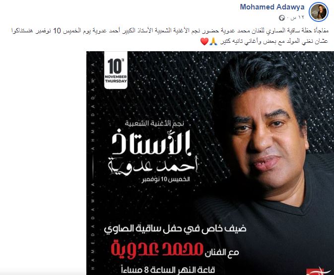 ونشر محمد عدوية عبر صفحته على موقع تبادل التواصل الإجتماعي "فيسبوك" قائلا: "مفاجأة حفلة ساقية الصاوي للفنان محمد عدوية حضور نجم الأغنية الشعبية الأستاذ الكبير أحمد عدوية يوم الخميس 10 نوفمبر هنستناكوا عشان نغني المولد مع بعض وأغاني تانيه كتير".🙏❤
