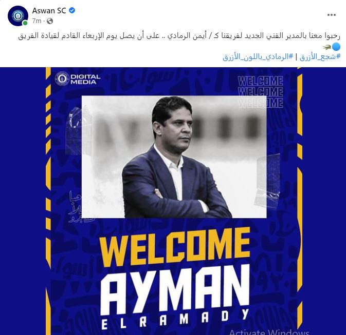 وقال نادي أسوان عبر صفحته الرسمية بموقع “فيس بوك"، أن أيمن الرمادي سيصل مصر الأربعاء المقبل لبداية مشواره مع الفريق الذي تذوق مرارة الهزيمة في المباريات الثلاث التي خاضها بمسابقة الدوري العام هذا الموسم.
