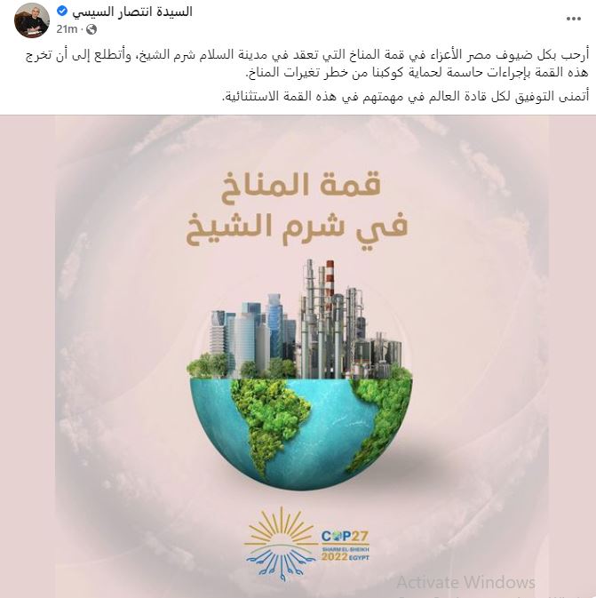 وكتبت السيدة انتصار السيسي، عبر حسابها الرسمى بموقع التواصل الاجتماعى "فيس بوك":"أتمنى التوفيق لكل قادة العالم في مهمتهم في هذه القمة الاستثنائية".