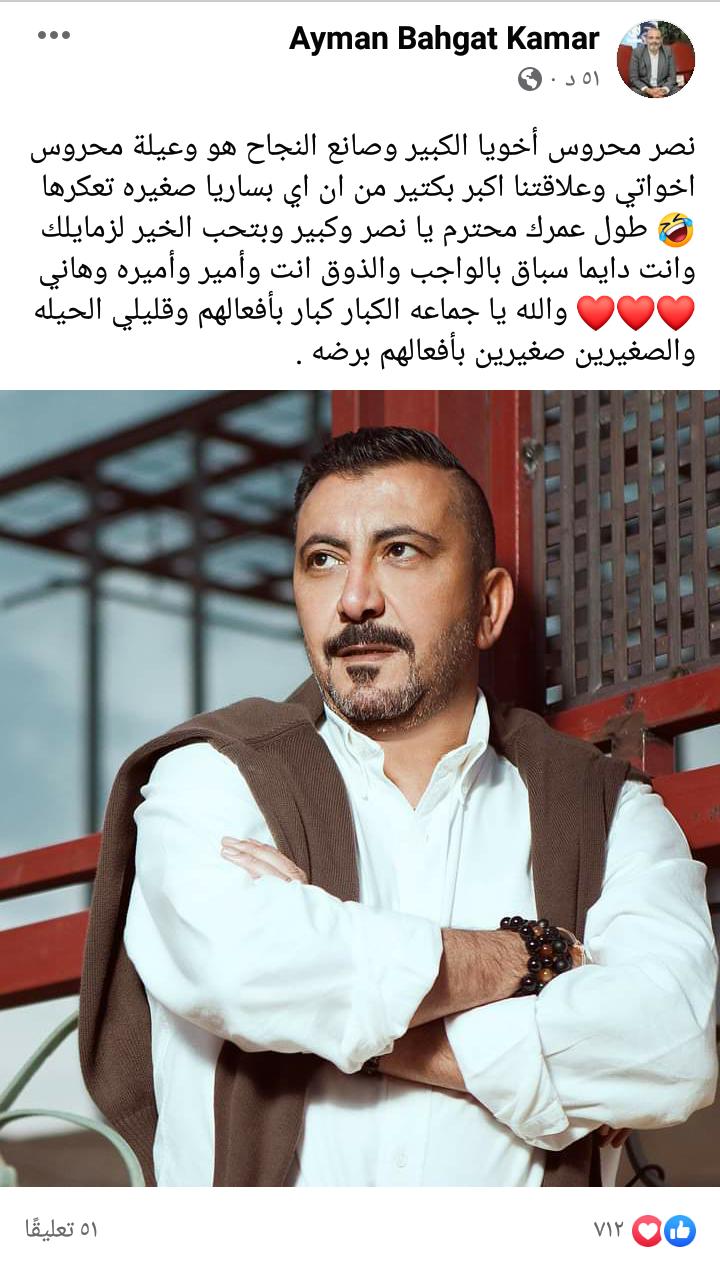 وكتب أيمن بهجت قمر عبرحسابه بموقع التواصل الاجتماعي “الفيس بوك”: قائلا" نصر محروس أخويا الكبير وصانع النجاح هو وعيلة محروس اخواتي طول عمرك محترم علاقتنا اكبر بكتير من ان اي بساريا صغيره تعكرها" .