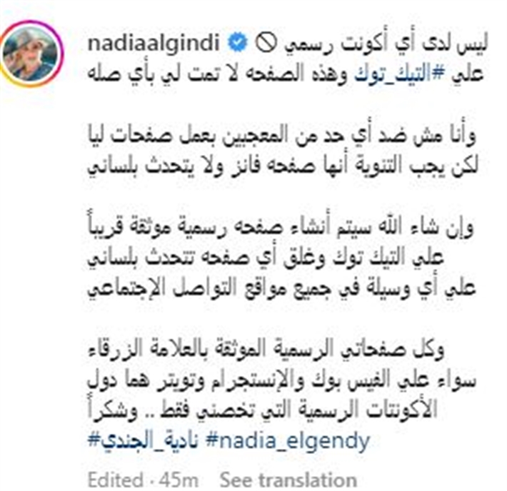 وكتبت نادية الجندي: "ليس لدى أي أكونت رسمي علي التيك توك وهذه الصفحة لا تمت لي بأي صلة، وأنا مش ضد أي حد من المعجبين بعمل صفحات لي، لكن يجب التنوية أنها صفحه فانز ولا يتحدث بلساني".