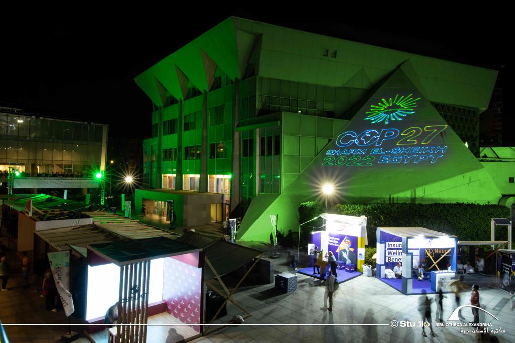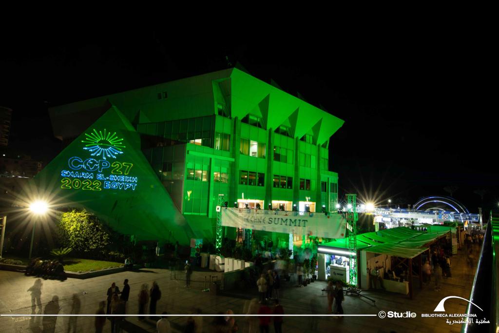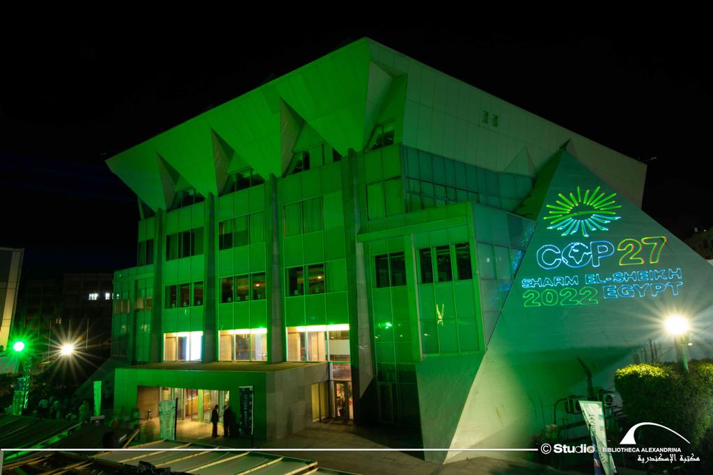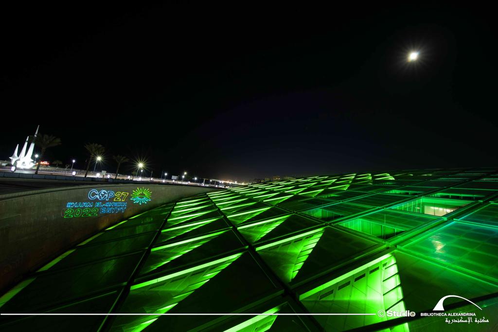 الإسكندرية في 6 نوفمبر - احتفلت مكتبة الإسكندرية اليوم الأحد الموافق 6 نوفمبر 2022 بانطلاق فاعليات مؤتمر الأطراف لاتفاقية الأمم المتحدة الإطارية حول تغير المناخ COP27 بشرم الشيخ، والذي سيستمر حتى 18 نوفمبر 2022، وذلك من خلال إضاءة مبنى المكتبة باللون الأخضر وعرض شعار المؤتمر على مبانيها، وهو الشعار الذي أطلقته مصر تزامنا مع استضافتها لهذا الحدث العالمي بحضور زعماء ورؤساء مختلف الدول ووفود رسمية مشاركة من جميع دول العالم.