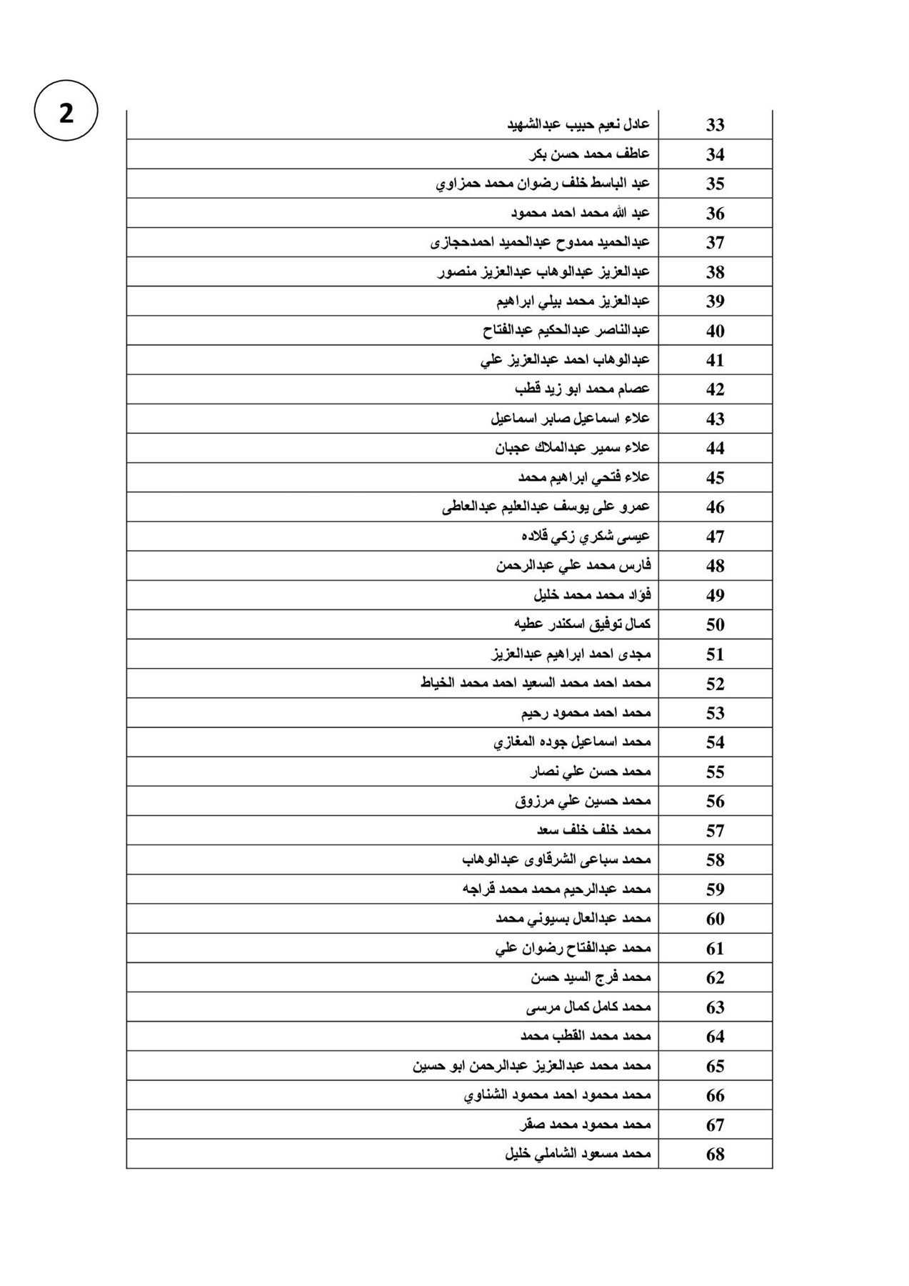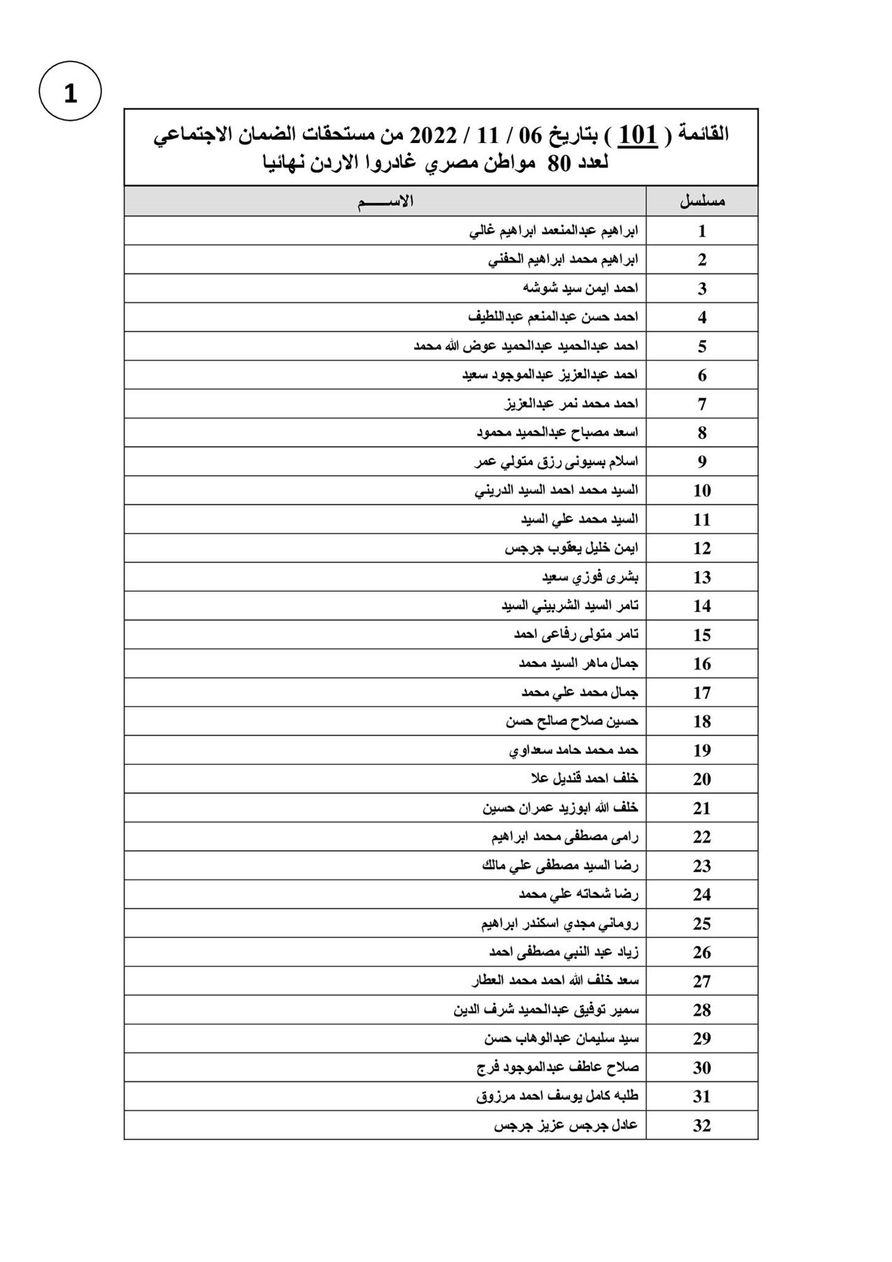 وأضاف الملحق العمالي، أنه طبقا لإجراءات المؤسسة العامة للضمان الاجتماعي بالأردن ، سيتم استرجاع المبالغ غير المصروفة بعد مرور 50 يوما من تاريخ الإعلان عن تحويل المستحقات، مشيرا إلى أنه يتم بشكل مستمر التنسيق والتجهيز لإرسال باقي الدفعات لمستحقيها تباعا، فور تدقيقها من الجهات المعنية حفاظا على حقوق المواطنين المستحقين لهذه الدفعات، وتضم القائمة الجديدة الأسماء المرفقة مع هذا البيان:
