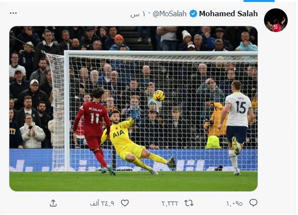 ونشر محمد صلاح عبر حسابه الشخصي على شبكة التواصل الاجتماعي "تويتر" صورة من إحرازه الهدف الثاني له وللريدز في المباراة، بعد أن سدد كرة "لوب" من فوق الحارس لوريس وتسكن شباكه.
