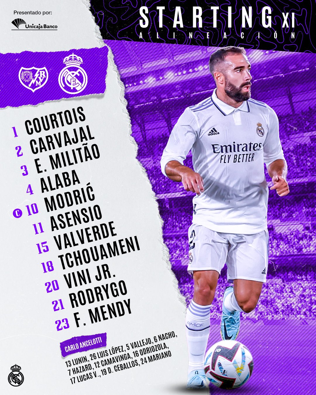أستقر الإيطالى كارلو أنشيلوتى، المدير الفني لفريق ريال مدريد، علي التشكيل الرسمي الذى يخوض مواجهة فريق رايو فاليكانو، والمقرر لها العاشرة مساء اليوم الإثنين، ضمن مواجهات الجولة 13 من منافسات الدوري الإسباني لموسم 2022-2023، على ملعب "فاييكاس".