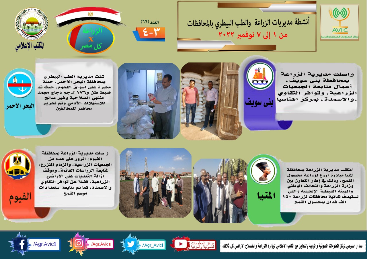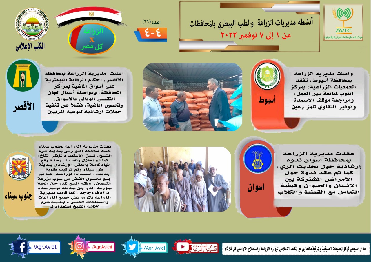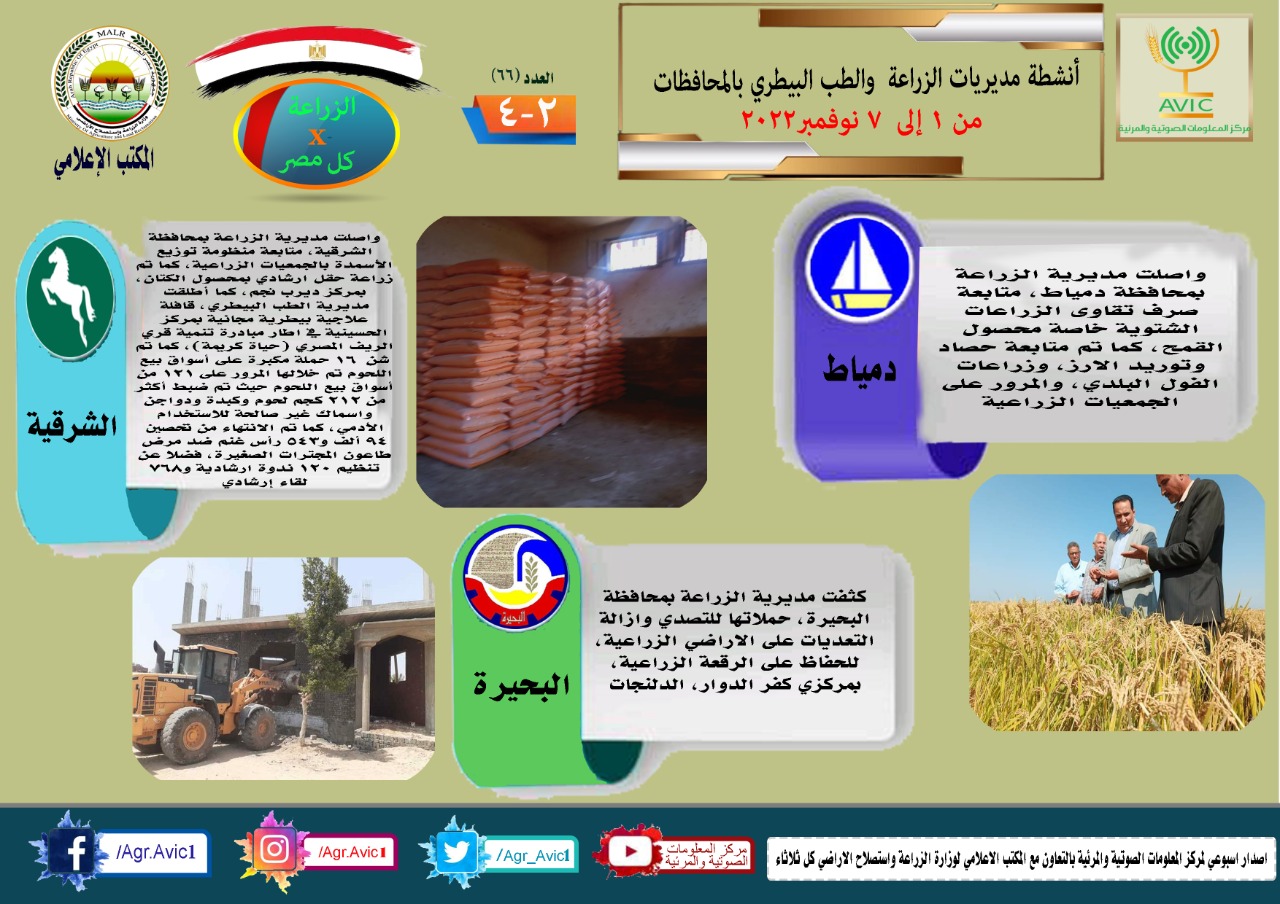 أصدر مركز المعلومات الصوتية والمرئية التابع لوزارة الزراعة واستصلاح الأراضي، والمكتب الاعلامي للوزارة، العدد رقم 66 من اصدار: "الزراعة في كل مصر" بالانفوجراف والفيديو، يوضح الجهود والانشطة التي تقوم بها مديريات الزراعة والطب البيطري بمحافظات الجمهورية خلال الفترة من ١ الى ٧ نوفمبر الجاري.