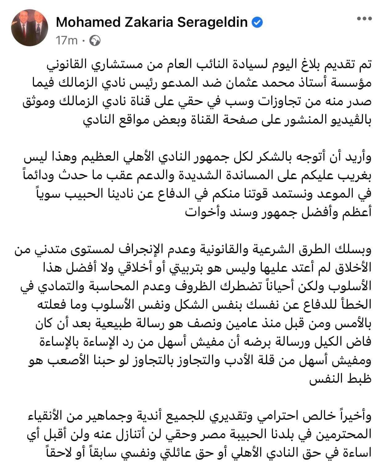 واختتم: "وأخيراً خالص احترامي وتقديري للجميع أندية وجماهير من الأنقياء المحترمين في بلدنا الحبيبة مصر وحقي لن أتنازل عنه ولن أقبل أي إساءة في حق النادي الأهلي أو حق عائلتي ونفسي سابقاً أو لاحقاً".