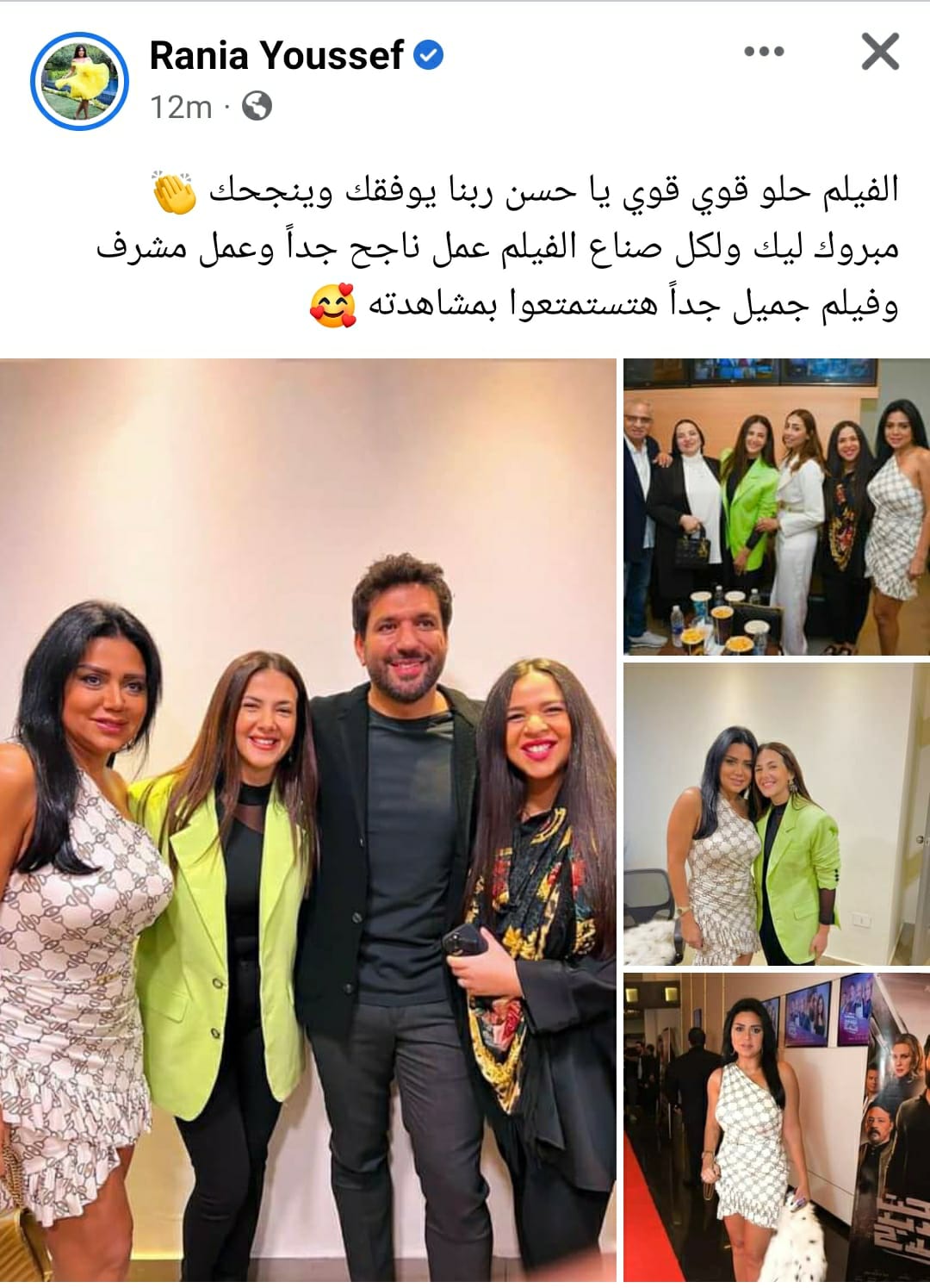 ونشرت رانيا يوسف عبر صفحتها الخاصة على موقع التواصل الإجتماعي “الفيسبوك” صور من العرض الخاص وعلقت عليها:" الفيلم حلو قوي قوي يا حسن ربنا يوفقك وينجحك.. مبروك ليك ولكل صناع الفيلم عمل ناجح جداً وعمل مشرف وفيلم جميل جداً هتستمتعوا بمشاهدته".