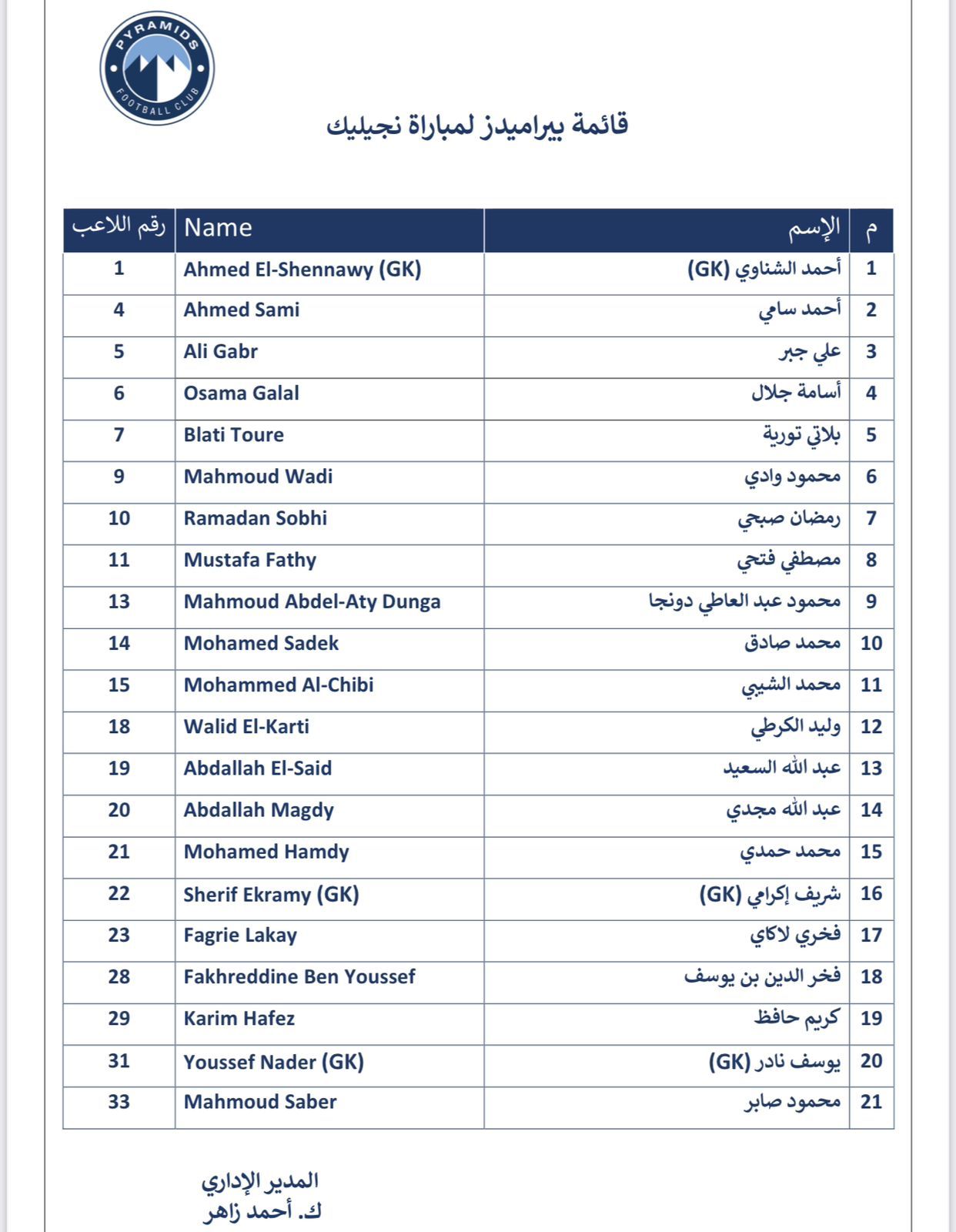 تعرف علي قائمة بيراميدز لمواجهة نيجيليك في إياب الكونفدرالية