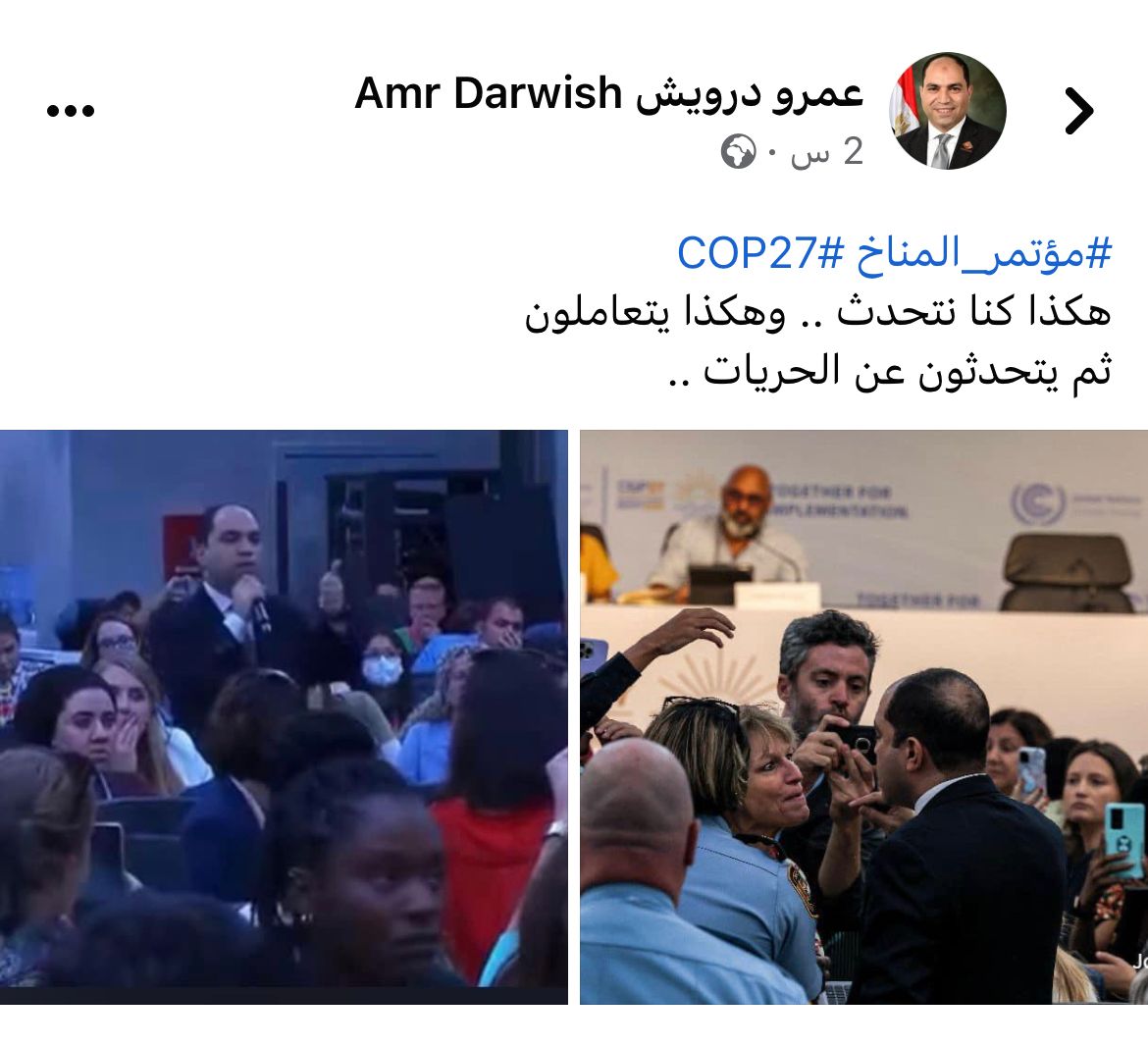 في أول تعليق له قال النائب عمرو درويش عضو مجلس النواب عن تنسيقية شباب الأحزاب والسياسيين، نشر عمرو دوريش صورة له أثناء محاولة منعه من الحديث في الجسلة التي نظمت على هامش مؤتمر المناخ والتي أدارتها سناء سيف عبدالفتاح، شقيقة علاء عبدالفتاح.