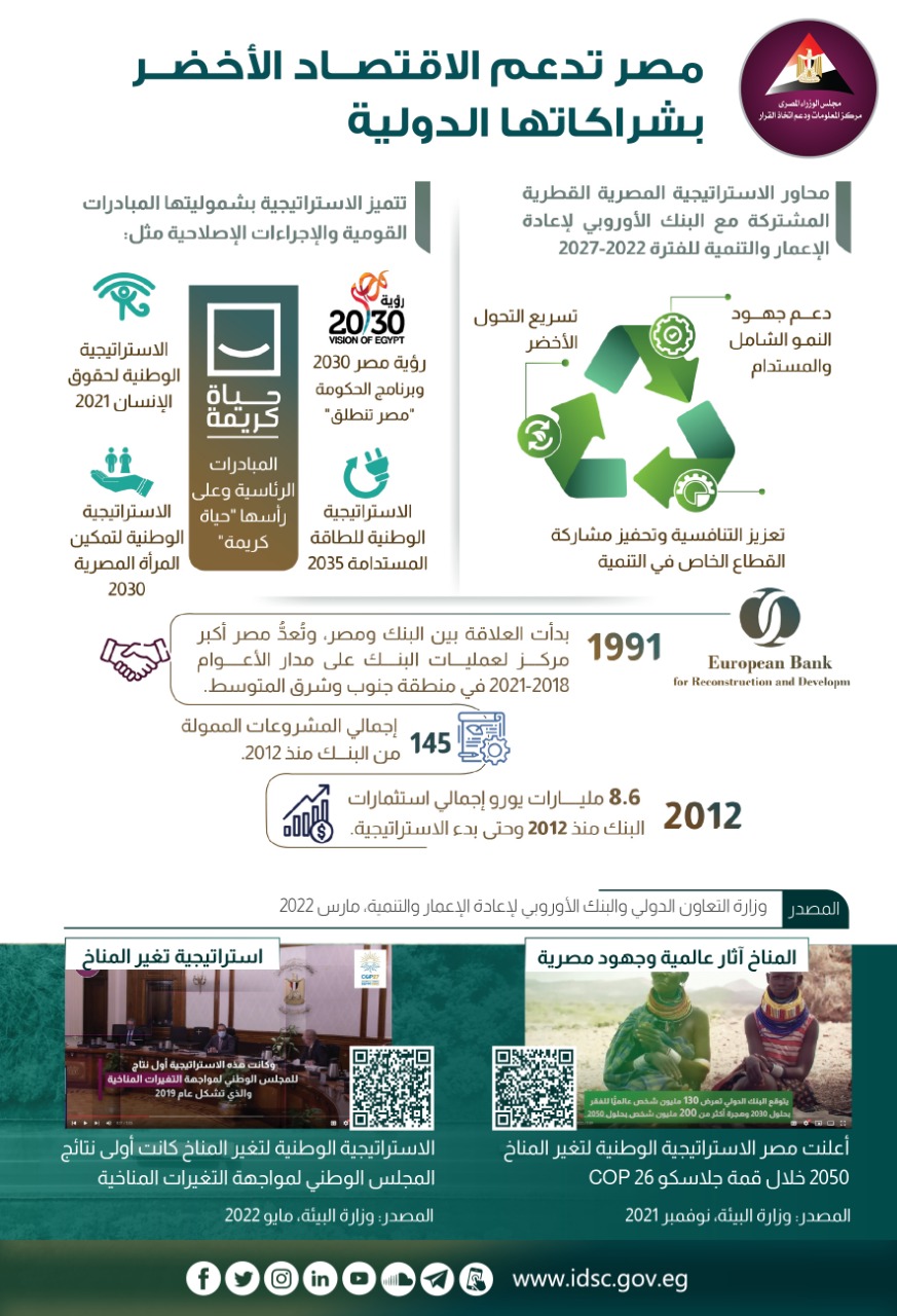 نشر مركز المعلومات ودعم اتخاذ القرار بمجلس الوزراء إنفوجرافيك بعنوان "مصر تدعم الاقتصاد الأخضر بشراكاتها الدولية" يسلط فيه الضوء على الجهود المصرية الكبيرة كبيرة في تفعيل الشراكات الدولية من أجل تحقيق الأهداف التنموية، وبمناسبة اليوم المتخصص للتمويل والتي من أبرزها الاستراتيجية المصرية القطرية المشتركة مع البنك الأوروبي لإعادة الإعمار والتنمية للفترة 2022-2027، وتتميز الاستراتيجية بشموليتها المبادرات القومية والإجراءات الإصلاحية مثل: رؤية مصر 2030، وبرنامج الحكومة "مصر تنطلق"، والاستراتيجية الوطنية لحقوق الإنسان 2021، والاستراتيجية الوطنية للطاقة المستدامة 2035، والاستراتيجية الوطنية لتمكين المرأة المصرية 2030.