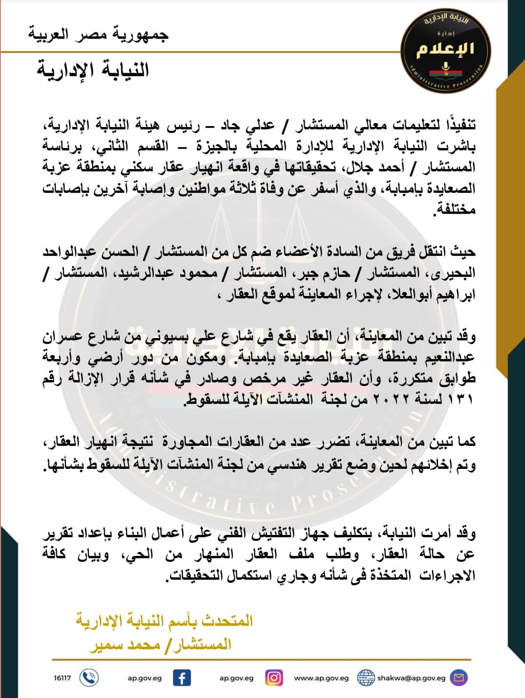 باشرت النيابة الإدارية للإدارة المحلية ، بالجيزة القسم الثاني، برئاسة المستشار أحمد جلال، تحقيقاتها في واقعة انهيار عقار سكني بمنطقة عزبة الصعايدة بإمبابة، والذي أسفر عن وفاة ثلاثة مواطنين وإصابة آخرين بإصابات مختلفة.تنفيذًا لتعليمات المستشار عدلي جاد رئيس هيئة النيابة الإدارية.