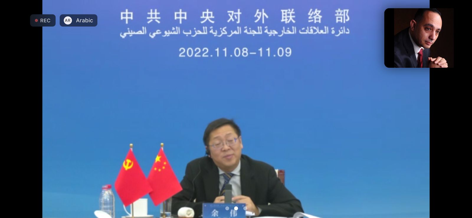 رئيس لجنة العلاقات الخارجية بالحزب الشيوعى الصينى، و ممثل الحزب الشيوعى الصينى والسادة ممثلي الأحزاب العربية: