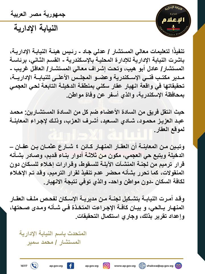 باشرت النيابة الإدارية للإدارة المحلية بالإسكندرية، القسم الثاني، برئاسة المستشار عادل أبو هيب، تحقيقاتها في واقعة انهيار عقار سكني بمنطقة الدخيلة التابعة لحي العجمي بمحافظة الإسكندرية، والذي أسفر عن وفاة مواطن، تحت إشراف المستشار العاقل غريب - مدير مكتب فني الإسكندرية وعضو المجلس الأعلى للنيابة الإدارية، وذلك تنفيذًا لتعليمات المستشار عدلي جاد، رئيس هيئة النيابة الإدارية.