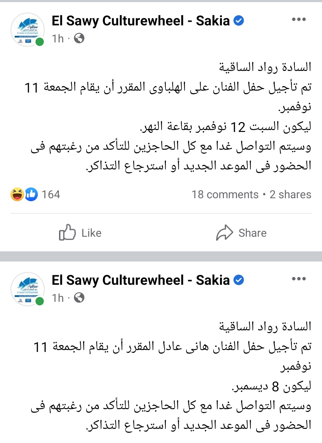 و أعلنت أيضًا إدارة ساقية عبد المنعم الصاوي تأجيل حفل الفنان علي الهلباوي، على "الفيسبوك" قائلة: "رواد الساقية، تم تأجيل حفل الفنان على الهلباوى المقرر أن يقام الجمعة 11 نوفمبر، ليكون السبت 12 نوفمبر بقاعة النهر، وسيتم التواصل غدا مع كل الحاجزين للتأكد من رغبتهم في الحضور في الموعد الجديد أو استرجاع التذاكر".