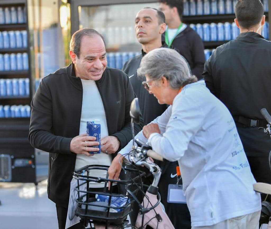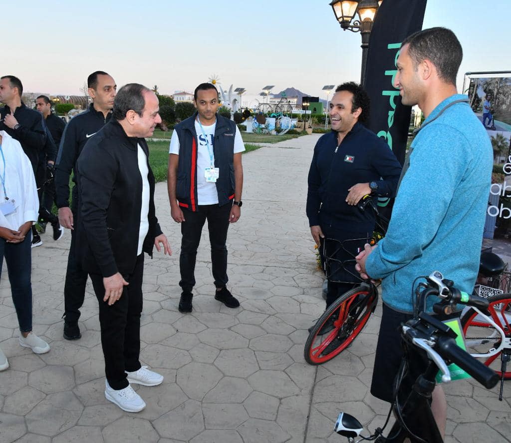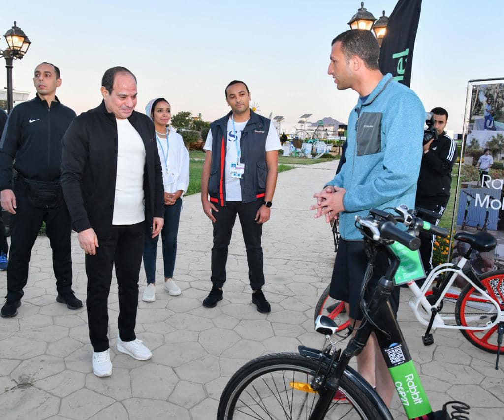 وشارك الرئيس السيسي في ماراثون ركوب الدراجات مع مجموعة من الشباب المشارك في المؤتمر، لإرسال رسالة للعالم حول أهمية الحفاظ على البيئة، حيث يوجد بالمنطقة الخضراء عدد من الأنشطة الرياضية الصديقة للبيئة مثل الدراجات الكهربائية وغيرها من الأنشطة.