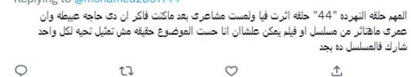 وجاء تعليق منهم :"المهم حلقة النهاردة 44، حلقة آثرت فيا ولمست مشاعري بعد ما كنت فاكر إن دي حاجة عبيطة وإن عمري ما هتأثر من مسلسل أو فيلم يمكن عشان أنا حست الموضوع حقيقة مش تمثيل تحية لكل واحد شارك في المسلسل ده بجد".