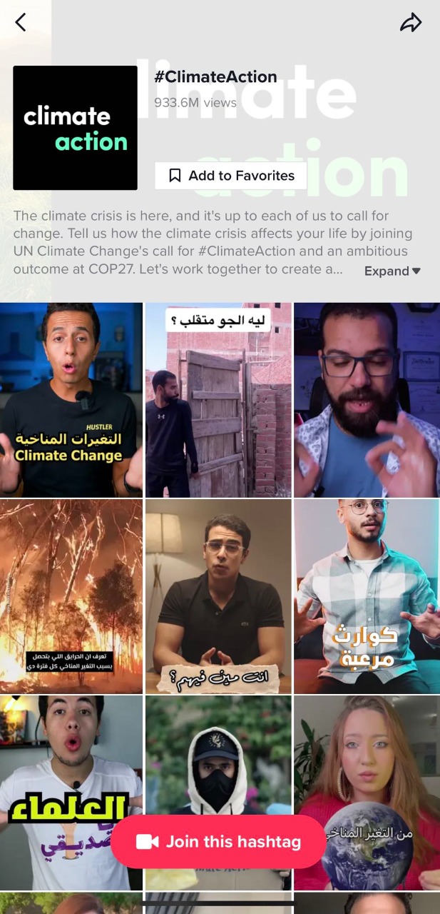 يجمع مؤتمر الأطراف COP27 قادة العالم والمجتمع المدني والشركات والأفراد في مواجهة التغيّر المناخي، لتتضافر جهودهم جميعًا لإحداث تغيير عاجل ومُلهم فيما يخص قضية المناخ. وباعتباره أحد أهم الأحداث المناخية في العالم، تتعاون تيك توك مع صانعي المحتوي، للإرتقاء بالمحتوى المناخي إلى مستوى أفضل وضمان دفع هذا المحتوى وهذه المحادثات إلى الصدارة.