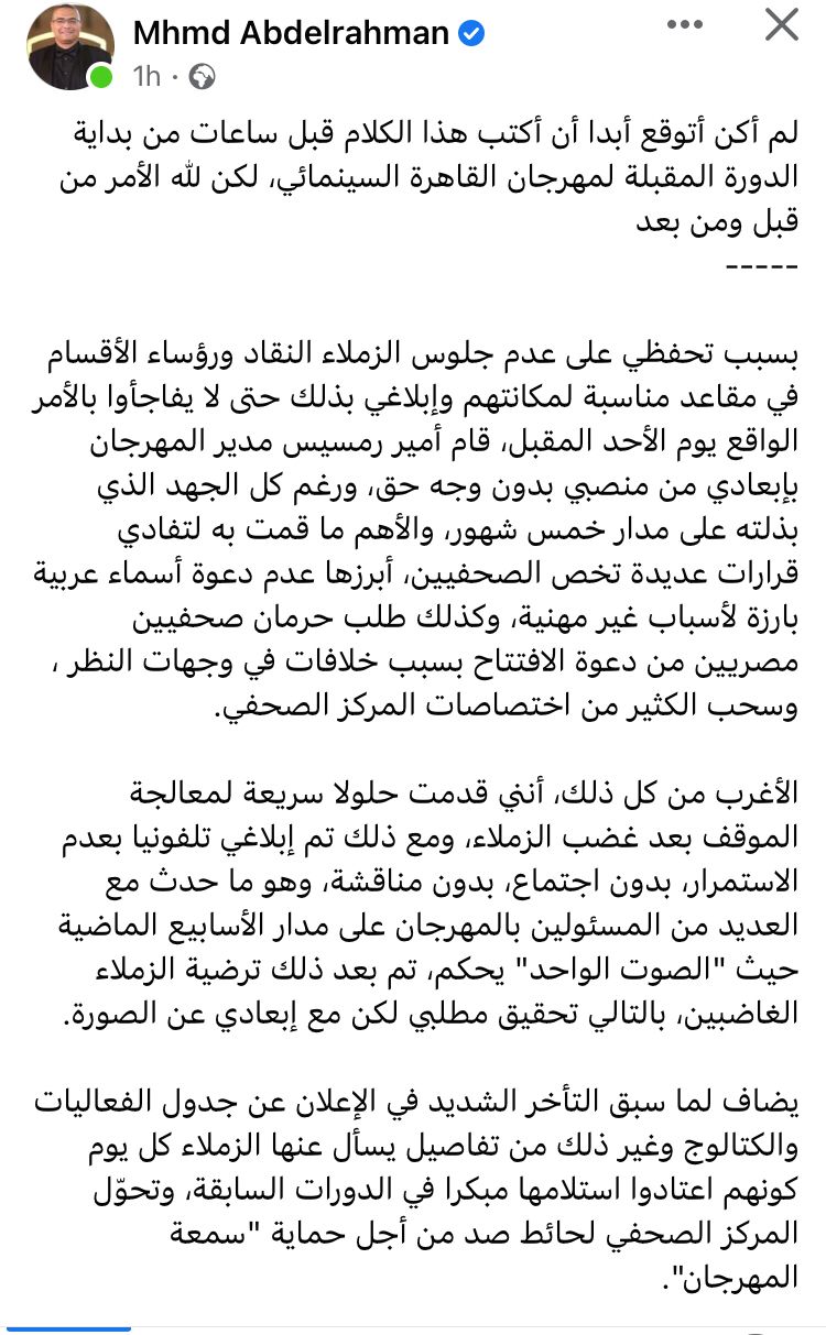 وجاء بيان محمد عبد الرحمن كالآتي: “لم أكن أتوقع أبدا أن أكتب هذا الكلام قبل ساعات من بداية الدورة المقبلة لمهرجان القاهرة السينمائي، لكن لله الأمر من قبل ومن بعد”.