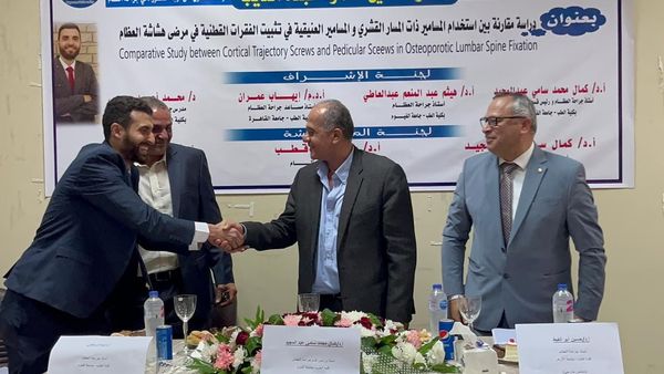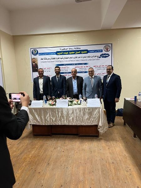 تأكيدًا على قوة ومتانة العلاقات بين جامعة الأزهر برئاسة الدكتور سلامة داود، رئيس الجامعة، ومختلف الجامعات المصرية في مختلف المجالات العلمية والبحثية؛ ناقش الدكتور حسين أبو الغيط، أستاذ جراحة العظام والعمود الفقري عميد كلية طب البنين جامعة الأزهر بالقاهرة، اليوم الخميس، رسالة دكتوراه في قسم جراحة العظام بكلية الطب جامعة الفيوم للطبيب محمود حسين محمود عبده الديب، بقسم جراحة العظام بكلية الطب جامعة الفيوم، تحت عنوان: دراسة مقارنة بين استخدام المسامير ذات المسار القشري والمسامير العنيقية في تثبيت الفقرات القطنية في مرضي هشاشة العظام، بدعوة كريمة من الدكتور كمال سامي عبد المجيد، أستاذ ورئيس قسم جراحة العظام بكلية الطب جامعة الفيوم.