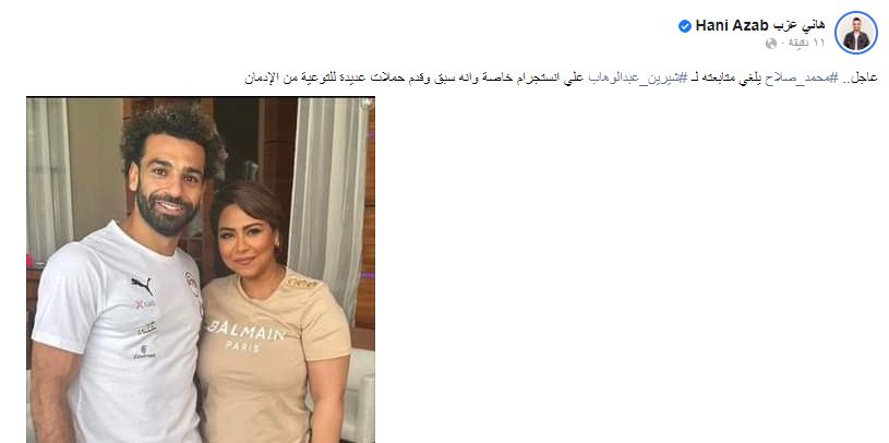 أعلن الكاتب الصحفي هاني عزب، عن إلغاء محمد صلاح متابعة الصفحة الخاصة بالفنانة شيرين عبدالوهاب خلال الساعات الماضية، لا سيما إنه سبق وقدم حملات للتوعية ضد إدمان المخدرات.