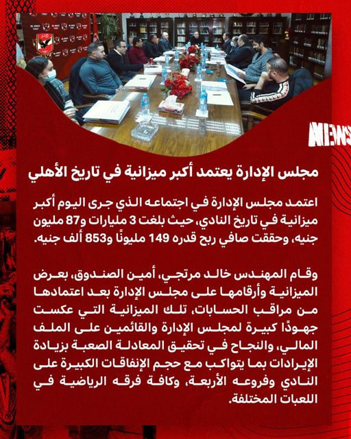 أعتمد مجلس إدارة النادي الأهلي، في اجتماعه الذي جري اليوم، أكبر ميزانية في تاريخ النادي، حيث بلغت 3 مليارات و 87 مليون جنية، وحققت صافي ربح قدرة 149 مليوناً و 853 ألف جنية.