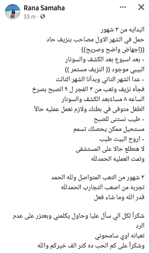 وكتبت رنا سماحة عبر حسابها على موقع التواصل الاجتماعي “فيس بوك”: البداية من 3 شهور حمل في الشهر الأول مصاحب بنزيف حاد (إجهاض واضح وصريح)، بعد أسبوع بعد الكشف والسونار البيبي موجود والنزيف مستمر، عدا الشهر التاني وبدأنا الشهر الثالث فجأة نزيف وتعب من 3 الفجر لـ 9 الصبح بصرخ الساعه 8 مساء بعد الكشف والسونار الطفل متوفى في بطنك ولازم نعمل عملية حالا.