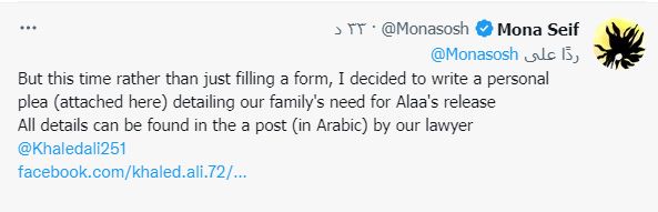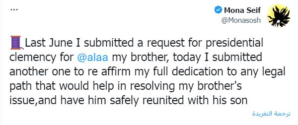 قالت منى سيف عبدالفتاح، شقيقة علاء عبدالفتاح، انها كانت قد تقدمت في مايو الماضي، بطلب عبر الموقع الرسمي للجنة العفو الرئاسي، للإفراج عن شقيقها، وأكدت عبر تغريدات باللغة الإنجليزية بموقع التواصل الأجتماعي “تويتر" أنها تقدمت اليوم بطلب أخر لإعادة تأكيد السير في المسار القانوني إذا كان من شأنه أن يساعد في حل مشكلة أخي ، ولم شمله بأمان مع ابنه.