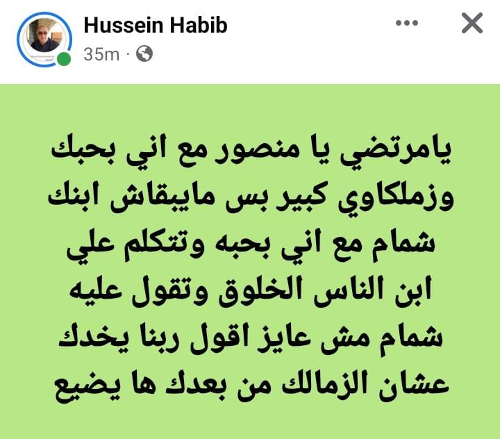 وكتب حسين حبيب عبر صفحته على موقع "فيسبوك" قائلا: "يا مرتضي يا منصور مع اني بحبك وزملكاوي كبير بس مايبقاش ابنك شمام مع اني بحبه وتتكلم علي ابن الناس الخلوق وتقول عليه شمام مش عايز اقول ربنا يخدك عشان الزمالك من بعدك ها يضيع".