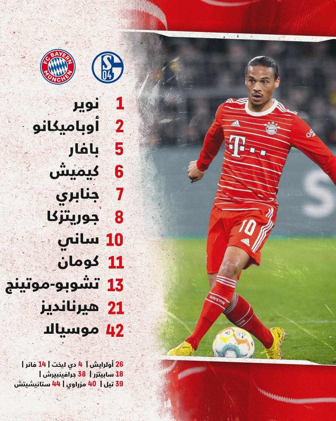 أعلن جوليان ناجلسمان، المدير الفنى لفريق بايرن ميونخ، عن تشكيل فريقه لمواجهة فريق شالكة، المقرر لها السابعة والنصف مساء اليوم، السبت، على ملعب "فيليتنيس أرينا"، ضمن منافسات الجولة الـ15 من مسابقة الدوري الألماني 2022-2023.
