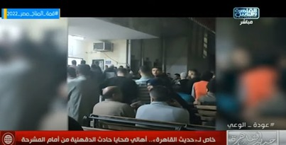 عرض أحد البرامج لقطات من أمام مشرحة مستشفى المنصورة الدولي، لأهالي ضحايا أتوبيس المنصورة المنتظرين لتسلم جثامين ذويهم الذين راحوا ضحية حادث الأتوبيس المنكوب.