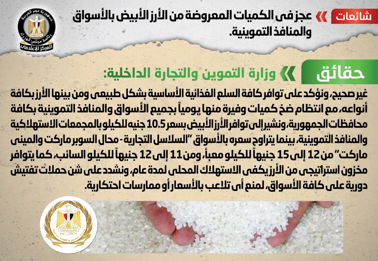 قام المركز الإعلامي لمجلس الوزراء بالتواصل مع وزارة التموين والتجارة الداخلية، والتي نفت تلك الأنباء، مُؤكدةً أنه لا صحة لوجود عجز في الكميات المعروضة من الأرز الأبيض بالأسواق والمنافذ التموينية، مُؤكدةً على توافر كافة السلع الغذائية الأساسية بشكل طبيعي ومن بينها الأرز بكافة أنواعه، مع انتظام ضخ كميات وفيرة منها يومياً بجميع الأسواق والمنافذ التموينية بكافة محافظات الجمهورية، مُشيرة إلى توافر الأرز الأبيض بسعر 10.5 جنيه للكيلو بالمجمعات الاستهلاكية والمنافذ التموينية، بينما يتراوح سعره بالأسواق "السلاسل التجارية - محال السوبر ماركت والميني ماركت" من 12 إلى 15 جنيهاً للكيلو معبأ، ومن 11 إلى 12 جنيهاً للكيلو السائب، كما يتوافر مخزون استراتيجي من الأرز يكفي الاستهلاك المحلي لمدة عام، مُشددة على شن حملات تفتيش دورية على كافة الأسواق، لمنع أي تلاعب بالأسعار أو ممارسات احتكارية.