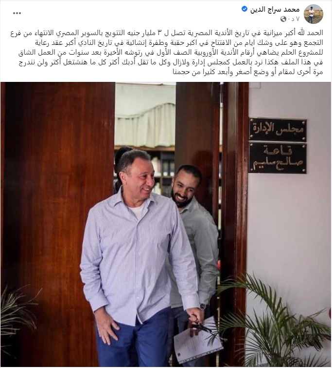 وكتب محمد سراج الدين، "الحمد لله أكبر ميزانية في تاريخ الأندية المصرية تصل لـ 3 مليار جنيه التتويج بالسوبر المصري الانتهاء من فرع التجمع وهو على وشك ايام من الافتتاح في اكبر حقبة وطفرة إنشائية في تاريخ النادي أكبر عقد رعاية للمشروع الحلم يضاهي أرقام الأندية الأوروبية الصف الأول في رتوشه الأخيرة بعد سنوات من العمل الشاق في هذا الملف هكذا نرد بالعمل كمجلس إدارة ولازال وكل ما تقل أدبك أكتر كل ما هنشتغل أكتر ولن نندرج مرة أخرى لمقام أو وضع أصغر وأبعد كثيرا من حجمنا".