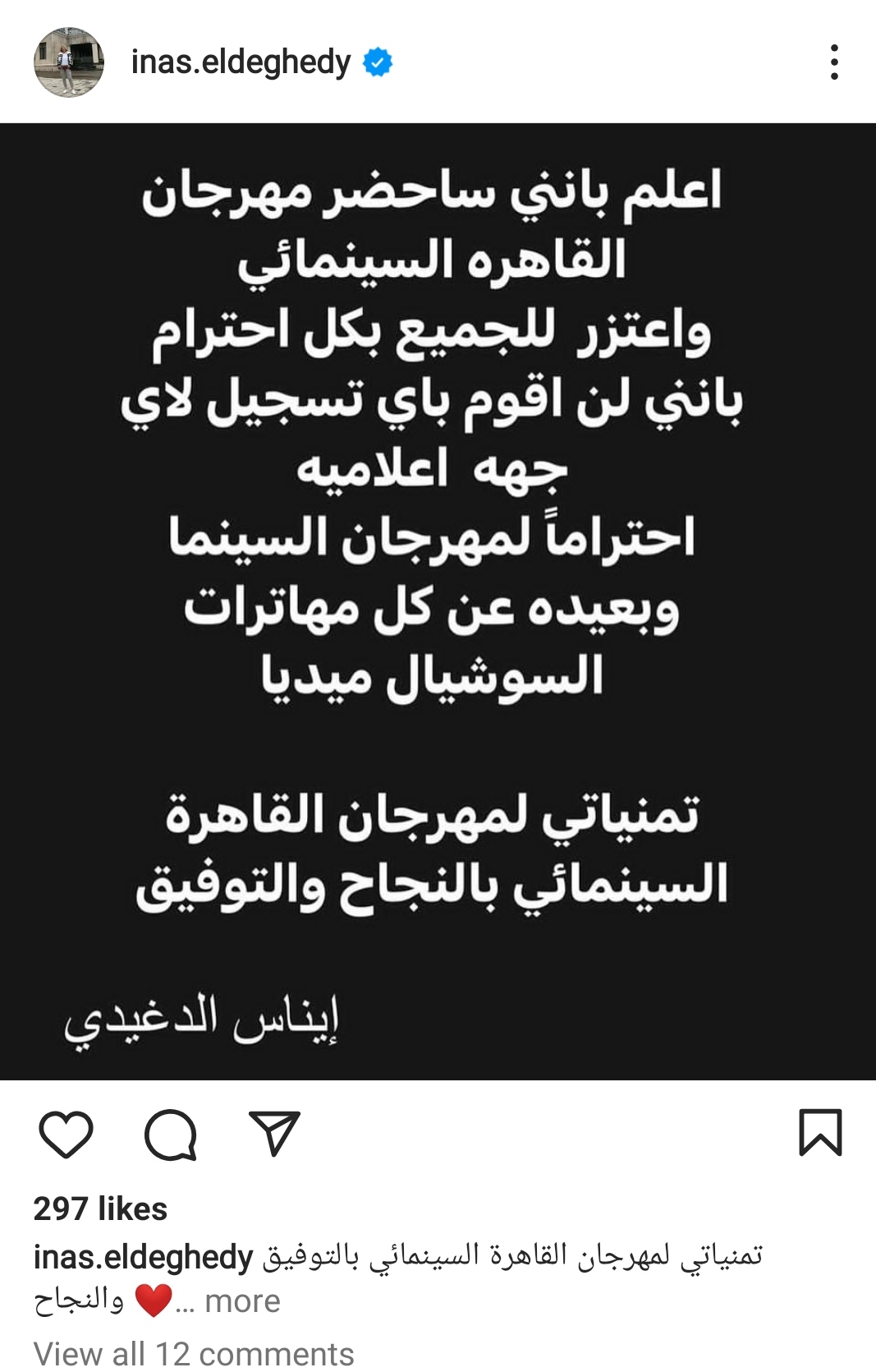 وكتبت إيناس الدغيدي، عبر حسابها على موقع تبادل الصور والفيديوهات "انستجرام"، قائلة: "أعلم بأنني سأحضر مهرجان القاهرة السينمائي وأعتذر للجميع بكل احترام بأنني لن أقوم بأي تسجيل لأي جهة إعلامية".
