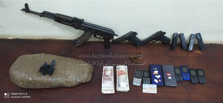 وعُثر بجوارهما على (بندقية آلية، 2 طبنجة، 66 طلقة مختلفة الأعيرة، 4 خزينة متنوعة ) وبتفتيش الشقة عُثر على (3 كيلو جرام من نبات البانجو المخدر، مبلغ مالى، 8 هواتف محمولة، 10خطوط هواتف محمولة).