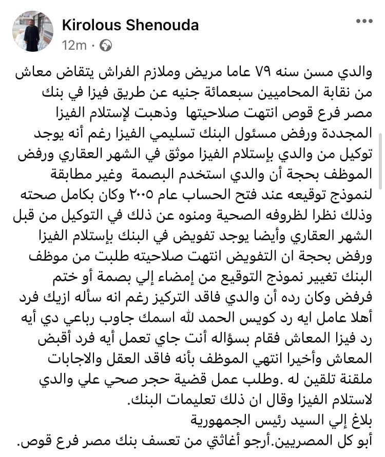 وسرد الشاب تفاصيل الواقعة مع موظف بنك مصر قائلا"والدي مسن 79 عاما مريض وملازم الفراش يتقاض معاش من نقابة المحاميين سبعمائة جنيه عن طريق فيزا في بنك مصر فرع قوص انتهت صلاحيتها وذهبت لإستلام الفيزا المجددة ورفض مسئول البنك تسليمي الفيزا رغم أنه يوجد توكيل من والدي بإستلام الفيزا موثق في الشهر العقاري ورفض الموظف بحجة أن والدي استخدم البصمة وغير مطابقة لنموذج توقيعه عند فتح الحساب عام 2005 وكان بكامل صحته وذلك نظرا لظروفه الصحية ومنوه عن ذلك في التوكيل من قبل الشهر العقاري وأيضا يوجد تفويض في البنك بإستلام الفيزا ورفض بحجة ان التفويض انتهت صلاحيته".