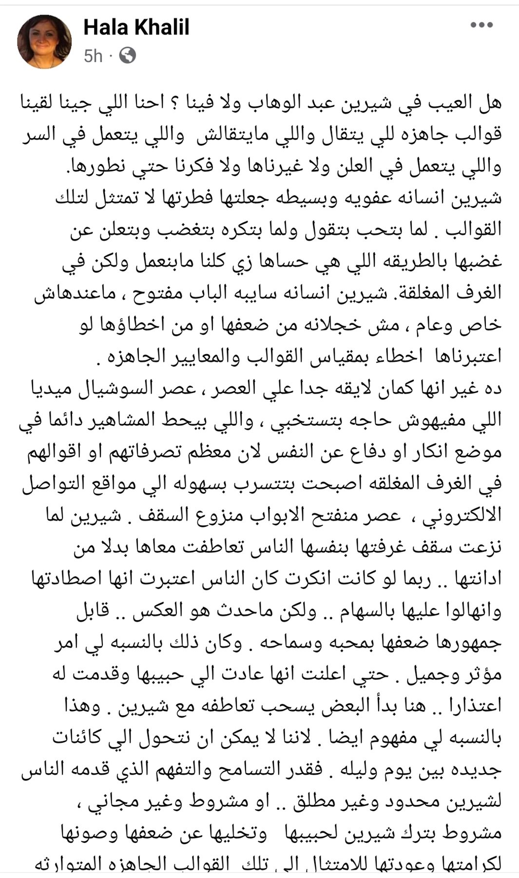ونشرت هالة خليل، عبر حسابها بموقع التواصل الاجتماعي "الفيسبوك" قائلة:" هل العيب في شيرين عبد الوهاب ولا فينا ؟ احنا اللي جينا لقينا قوالب جاهزه للي يتقال واللي مايتقالش واللي يتعمل في السر واللي يتعمل في العلن ولا غيرناها ولا فكرنا حتي نطورها".