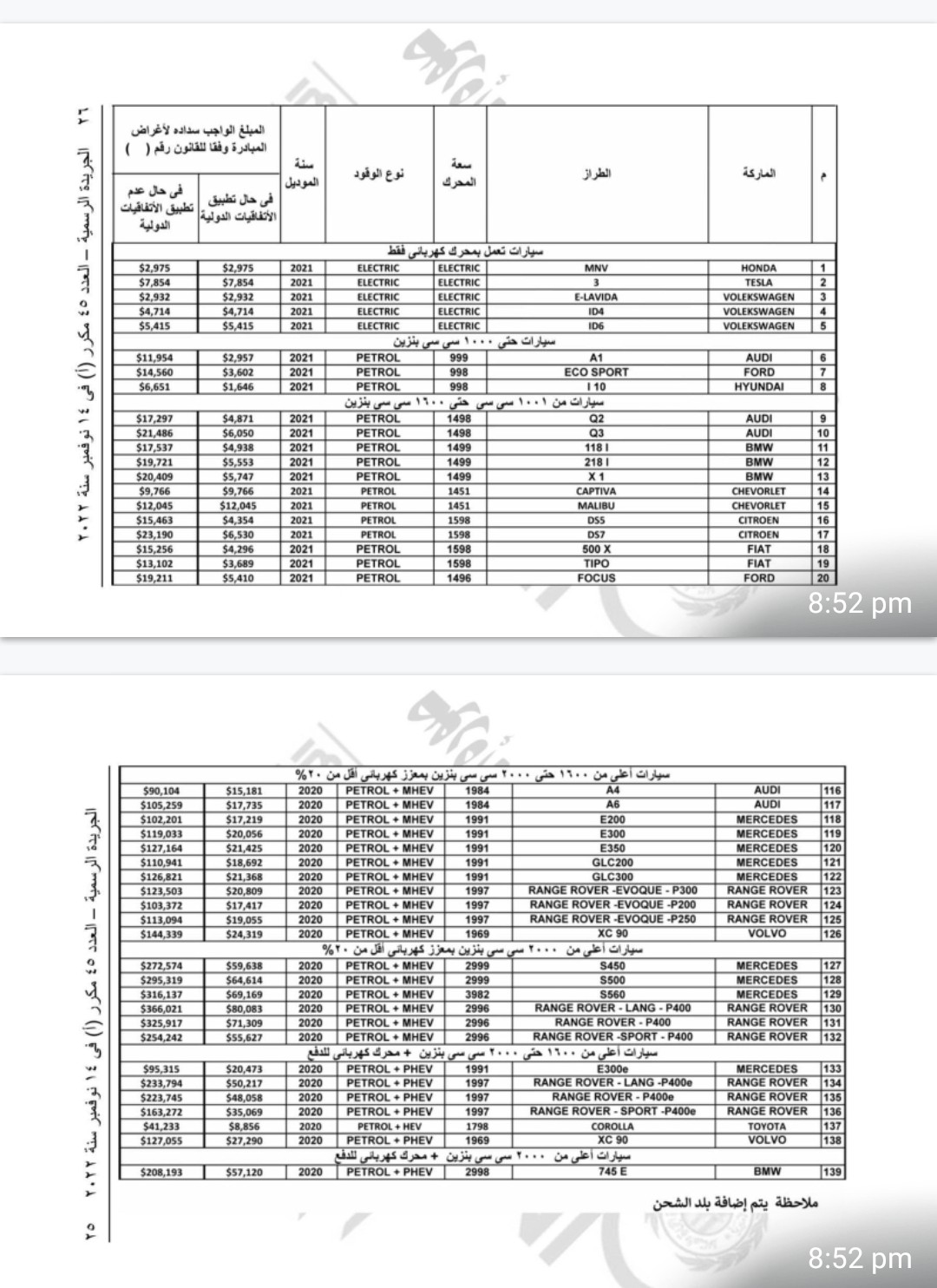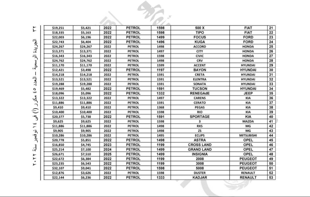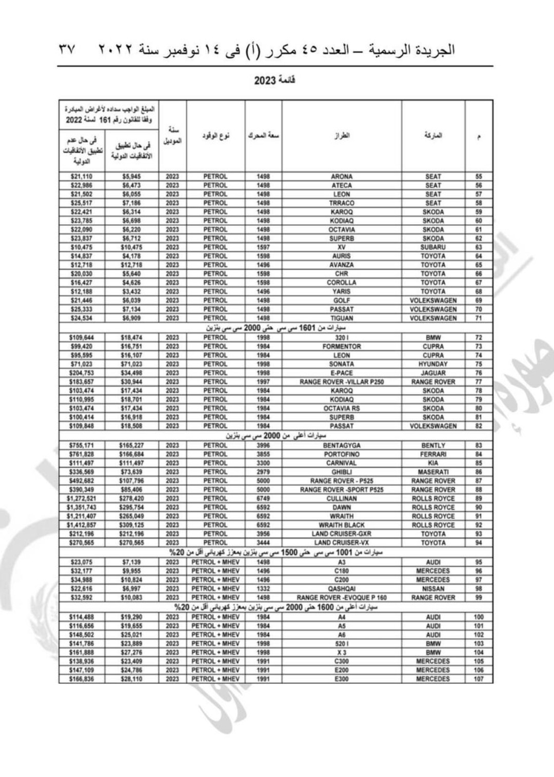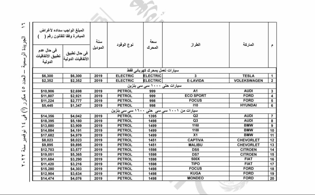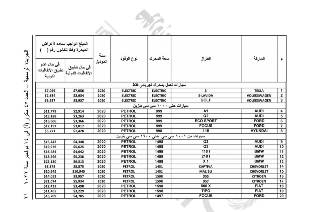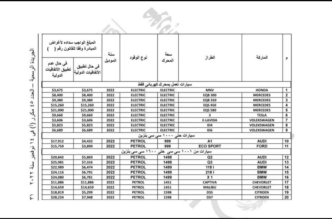 ينشر "مصر تايمز" جداول المبالغ المالية المستحقة لاستيراد سيارات المصريين في الخارج بدون جمارك في صورة وديعة تُسترد بعد 5 سنوات.
